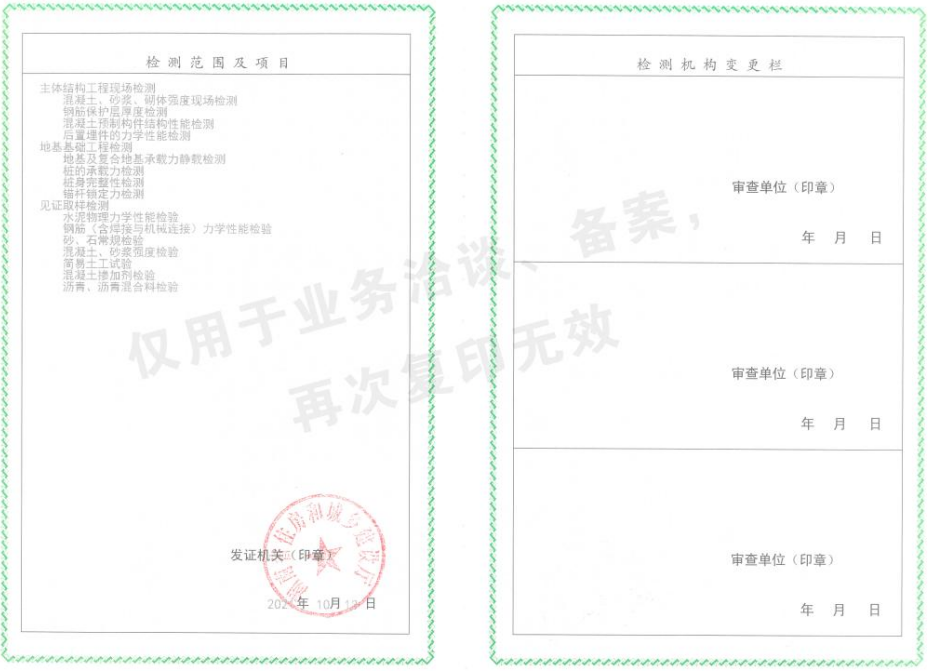2021年10月公司獲批建設(shè)工程質(zhì)量檢測機構(gòu)資質(zhì)證書